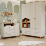 Ideal para quem busca praticidade e estilo, essa cômoda apresenta um design lúdico e funcional, oferecendo amplo espaço de armazenamento para o enxoval do bebê. Com nicho superior, três gavetas grandes com corrediças telescópicas, uma porta com prateleira interna e cabideiro, proporciona organização otimizada e fácil acesso às roupas. Os detalhes em madeira maciça e a pintura atóxica garantem um acabamento encantador e seguro. Da mesma forma, o roupeiro complementa o ambiente com seu charme e praticidade, oferecendo quatro gavetas espaçosas, nichos laterais decorativos e amplos espaços internos para guardar desde objetos menores até malas e pacotes de fraldas, tudo fabricado com matéria-prima ecologicamente correta e de alta durabilidade.